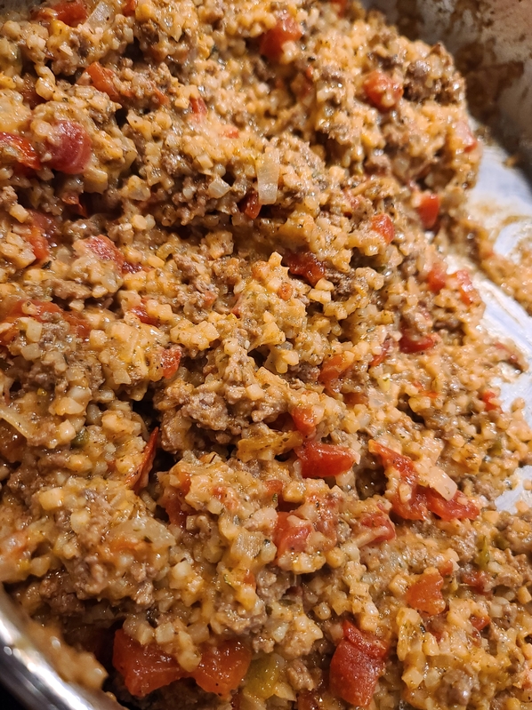 - Add cauliflower rice, rotel, and remaining seasonings to ground beef mixture. Mix well to fully incorporate the new ingredients. Simmer until the rotel is fully heated, about 2-3 minutes. Remove from heat and stir in half of the cheese.